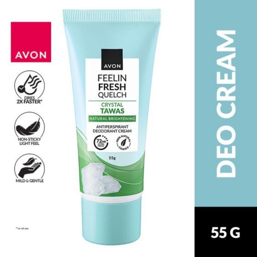 Gentle to underarms + helps skin look brighter in 1 week! This floral musky citrus scented deodorant cream contains 100% Tawas, provides gentle protection from underarm wetness and odor. It glides on smoothly, leaves skin touchably soft and fresh. Formulated with Dry Pore Technology and Avon Patented Ingredient - TDPA, it provides 48-Hour protection against underarms odor and helps to brighten skin. Now with two-way applicator that allows you to squeeze controlled amount to fingers or directly apply on underarms. Easy-to-use and provides smooth application on the skin. Alcohol-Free. Colorant-Free. Non-sticky. Dermatologically-tested. Absorbs quickly. Lightweight