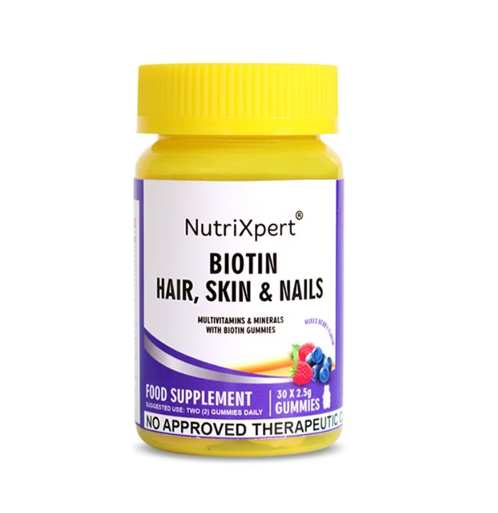 NutrXpert Hair, Skin & Nails Gummies deliver 5000mcg of biotin plus essential multivitamins and minerals in every tasty mixed berry chew. With just one delicious gummy a day, you can support stronger hair, glowing skin, and healthy nails—no pills required.