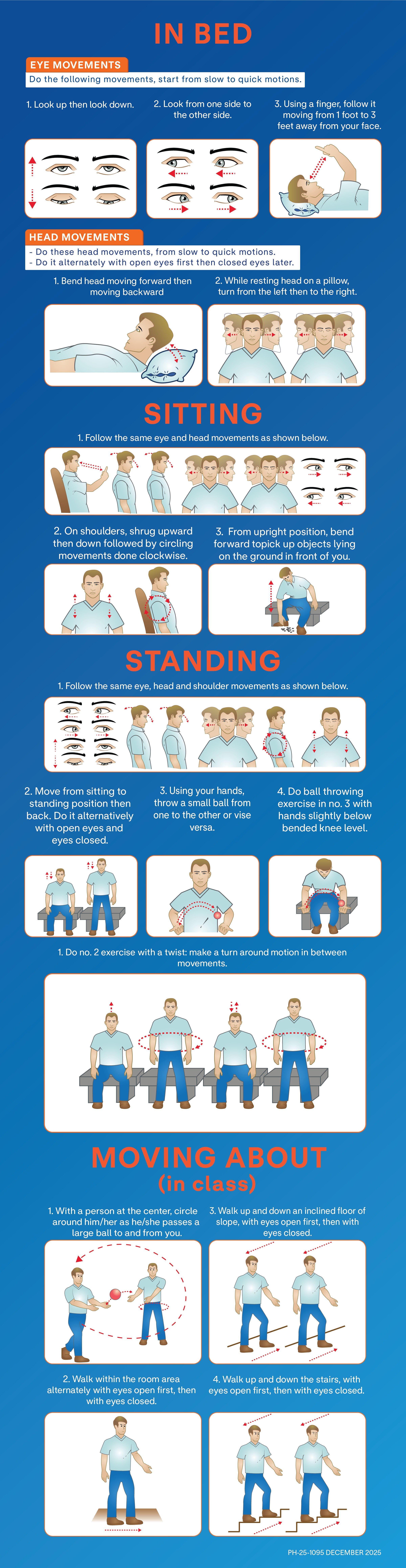 Below are exercises that will help you cope with vertigo. Please take note that individual patients should be accompanied by a friend or a relative who is also learning the exercises and that this information is intended for your general knowledge only and is not a substitute for professional medical care. This chart should be used only under the supervision and direction of your physician. Please consult your physician with any questions or concerns you may have about your condition.