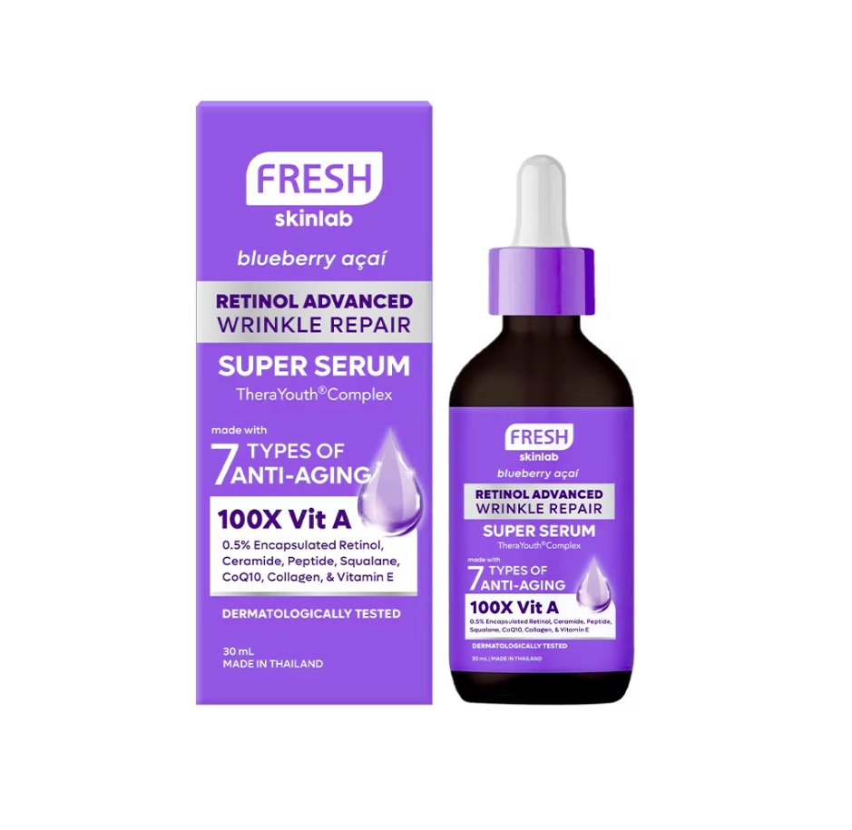 FRESH Skinlab Retinol Advanced Wrinkle Repair Super Serum is a lightweight, non‑sticky serum powered by the TheraYouth Complex, featuring 7 skincare actives such as Retinol, Ceramide, Peptides, and Vitamin E. It helps improve the appearance of early signs of skin aging while promoting smoother, hydrated, and more radiant‑looking skin with regular use.