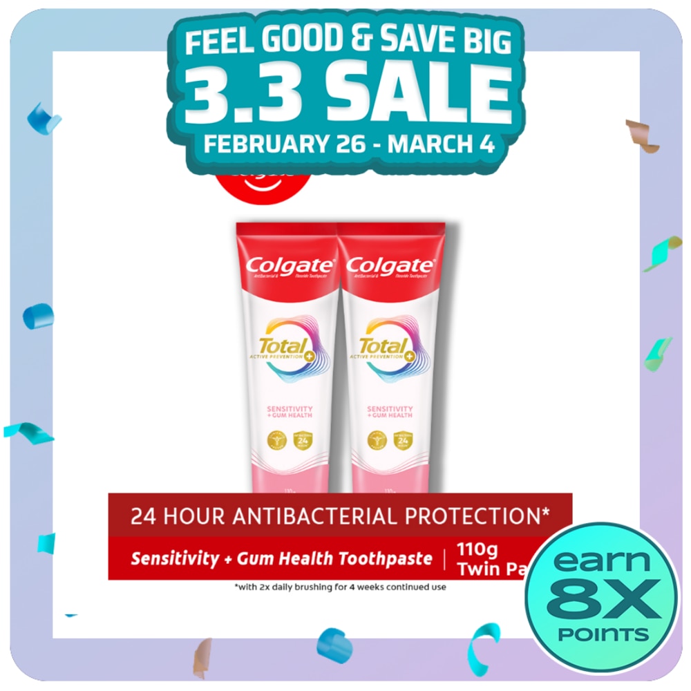 "Prevent top 8 oral care problems before they start with our BEST solution! Our NEW Colgate Total is engineered to be 3X more effective^ at fighting a key root cause of many preventable issues such as: Gum Concerns, Plaque, Tartar, Sensitivity, Enamel Erosion, Surface Stains, Breath Concerns, Cavities. It is formulated with our Patented BioActive Stannous Fluoride technology that proactively fights bacteria for up to 24 HOURS*! Colgate Sensitivity + Gum Health is specially formulated to have a smooth, mild, and gentle brushing experience for those who want prevention but worry about irritating sensitive teeth. Prevent sensitivity in as fast as 1 day*! Try our NEW Total now! ^ by reducing plaque vs. regular toothpaste in as early as 3 months with 2x daily use *with 2x daily brushing for 4 weeks"