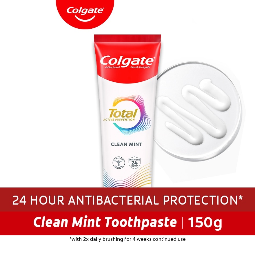 "Prevent top 8 oral care problems before they start with our BEST solution! Our NEW Colgate Total is engineered to be 3X more effective^ at fighting a key root cause of many preventable issues such as: Gum Concerns, Plaque, Tartar, Sensitivity, Enamel Erosion, Surface Stains, Breath Concerns, Cavities. It is formulated with our Patented BioActive Stannous Fluoride technology that proactively fights bacteria for up to 24 HOURS*! Colgate Total Clean Mint is specially formulated to have gritty paste made with micro-cleaning particles with a thick, rich foam to help give a deeper clean in hard to reach places**. Try our NEW Total now! ^ by reducing plaque vs. regular toothpaste in as early as 3 months with 2x daily use *with 2x daily brushing for 4 weeks **in as early as 3 months with 2x daily use"