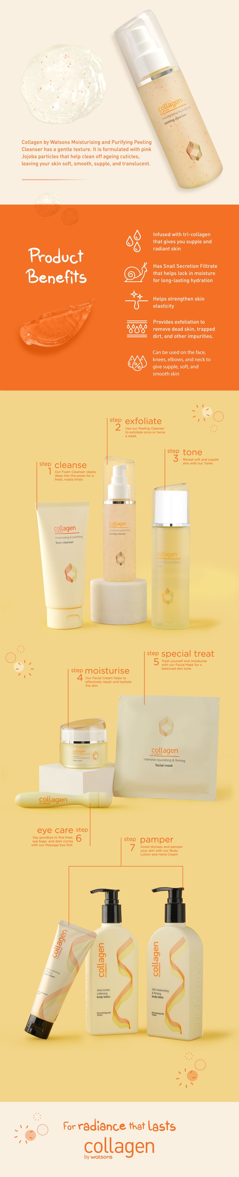 Upgraded with Tri-collagen Complex from Europe, Collagen by Watsons Moisturising Range helps retain and replenish skin moisture for long-lasting hydrating effect, and helps improve skin elasticity, resulting in moisturised skin and a radiant complexion.