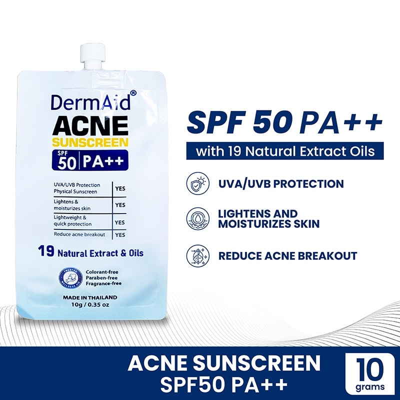 <h2>Thailand DERMAID Acne Sunscreen 10g</h2><p>Dermaid Acne Sunscreen, a lightweight, non-greasy, and quick-protection sunscreen. It has an SPF50 PA++ that offers skin protection against UVA and UVB rays. Formulated with Salicylic Acid and 8 natural extracts that helps reduce acne breakout, soothe and moisturize the skin while Niacinamide I helps lighten and improve skin texture for a smoother and younger glowing complexion.</p>
