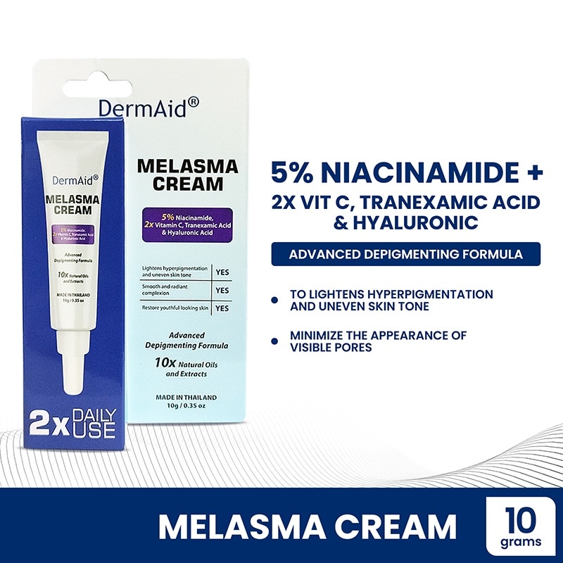 Dermaid Melasma Cream Serum 10g Dermaid Melasma Cream features a concentrated formula with 5% Niacinamide, 2x Vitamin C, and Tranexamic Acid, designed to enhance the skin's natural glow, minimize the appearance of visible pores, and lighten dark spots, discoloration, and an uneven complexion. Infused with an Advanced Depigmenting Formula, it reduces hyperpigmentation, improves skin elasticity, and promotes a healthier skin barrier. Additionally, it contains Vitamin E, oils, and natural extracts to nourish and soothe the skin, resulting in a glowing and youthful complexion.