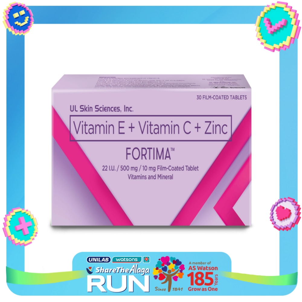 A unique combination of three (3) powerful ingredients: 500mg of Vitamin C, 10mg of Zinc, and 22 I.U. of Vitamin E. Fortima gives the immunity, strength of body, while maintaining your skin's health and radiance.