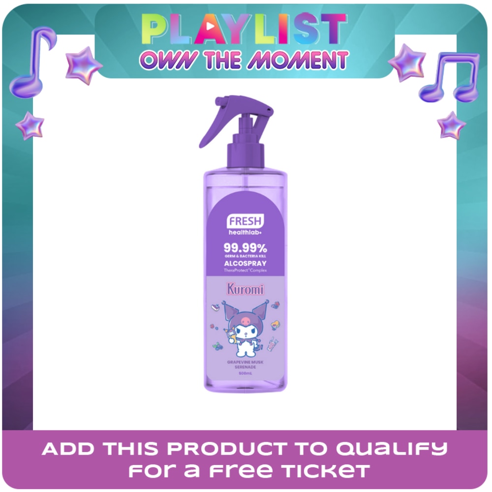 Fresh Sanrio Kuromi Grapevine Musk Serenade 500mL. Elevate your kawaii vibes with Fresh Alcospray! It helps fight off 99.99% of germs and bacteria, with aloe vera extract that moisturizes your skin while leaving behind a lasting scent of whimsical fruity-floral goodness.