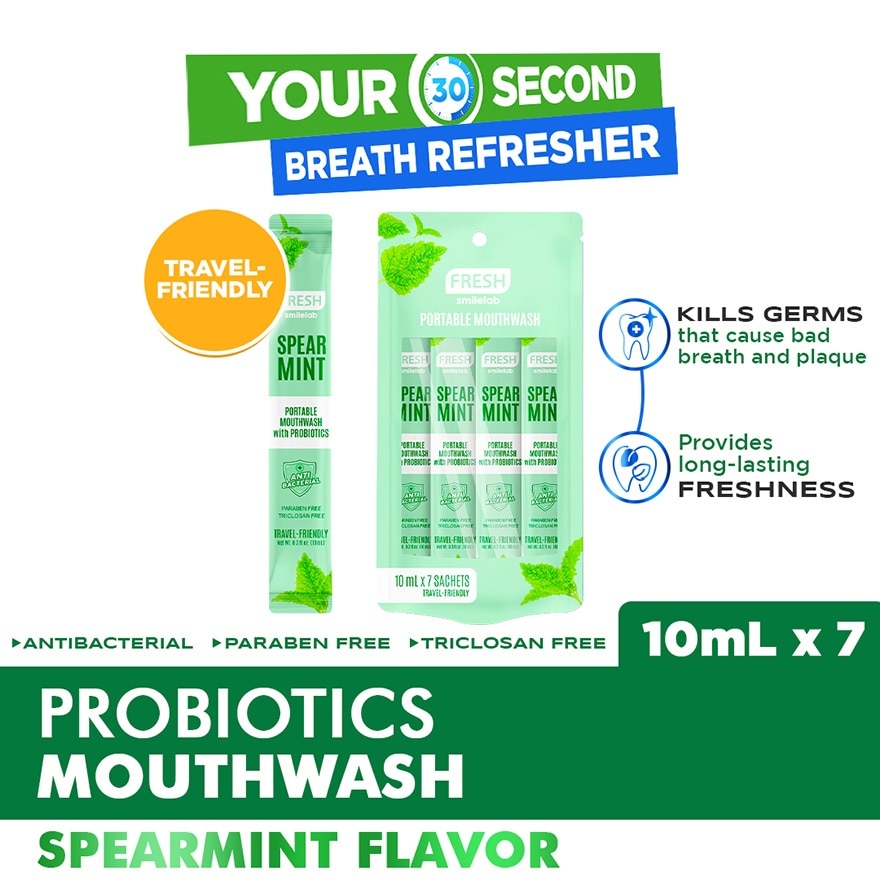 The Fresh Smilelab Spearmint Portable Mouthwash with Probiotics is designed for those who want fresher breath, cleaner teeth, and a healthier oral environment anytime, anywhere. Each compact sachet is infused with Lactobacillus probiotics to help support your oral microbiome—a key factor in maintaining a balanced mouth environment. This gentle, daily-use formula helps neutralize odor, reduce plaque buildup, and leave your mouth feeling refreshed with cool spearmint freshness.This probiotic mouthwash is ideal for people looking for a convenient rinse they can use after meals, before meetings, during commutes, or anytime they need an instant clean-breath boost. It is paraben-free, triclosan-free, and easy to stash in pouches, pockets, travel kits, or work bags. Perfect for those who want on-the-go freshness without the bulk of a full bottle.⭐ Key Features & Benefits• Infused with Lactobacillus probiotics to support the oral microbiome• Helps neutralize breath odor• Helps reduce plaque buildup for a cleaner mouth feel• Spearmint flavor leaves breath fresh and cool• Portable 10 mL sachets for convenient on-the-go use• Paraben-free and triclosan-free• Antibacterial formula suitable for daily use• Travel-friendly and hygienic single-use packaging⭐ How to UseUse after brushing for deeper mouth cleansing and long-lasting fresh breath.You may also rinse with one sachet any time of day to freshen breath, especially after meals, coffee, or long conversations.Swish for 30 seconds, then spit out. No need to rinse with water.Not suitable for children under 6 years of age. Supervise children if needed.