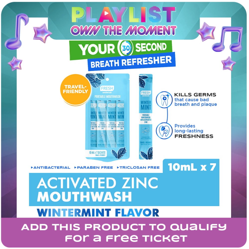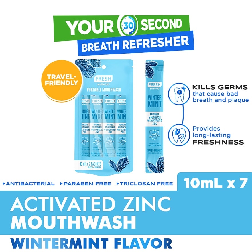 Fresh Smilelab Wintermint Portable Mouthwash is a travel-friendly rinse designed to keep your breath fresh and your mouth clean anytime, anywhere. Formulated with Activated Zinc (Zinc Citrate), this portable mouthwash helps reduce odor-causing bacteria and plaque while helping neutralize yellow tones. The crisp wintermint flavor provides an instant cooling feel, leaving your breath fresh and your smile feeling clean throughout the day.Each 10mL sachet is individually packed for convenience—perfect for use after meals, coffee, commuting, or before meetings. The formula is paraben-free and triclosan-free, making it an easy addition to a daily oral care routine for anyone who wants fresher breath without carrying a full-sized bottle. Ideal for people on the go, travelers, office workers, and students.Key Features & Benefits• With Activated Zinc (Zinc Citrate) to help reduce bacteria that cause odor and plaque• Helps neutralize yellow tones for a visibly fresher-looking smile• Crisp wintermint flavor for instant fresh breath anytime• Convenient, travel-friendly 10mL sachets—easy to carry and use on the go• Paraben-free and triclosan-free formula• Can be used after brushing or between routines for a cleaner afterfeelSuggested UseUse after brushing for deeper cleansing of the mouth and teeth. Swish the contents of one sachet thoroughly and spit out. Can also be used to rinse away residue after meals, coffee, or brushing for a fresher mouthfeel. Suitable for daily use as part of your regular oral care routine.