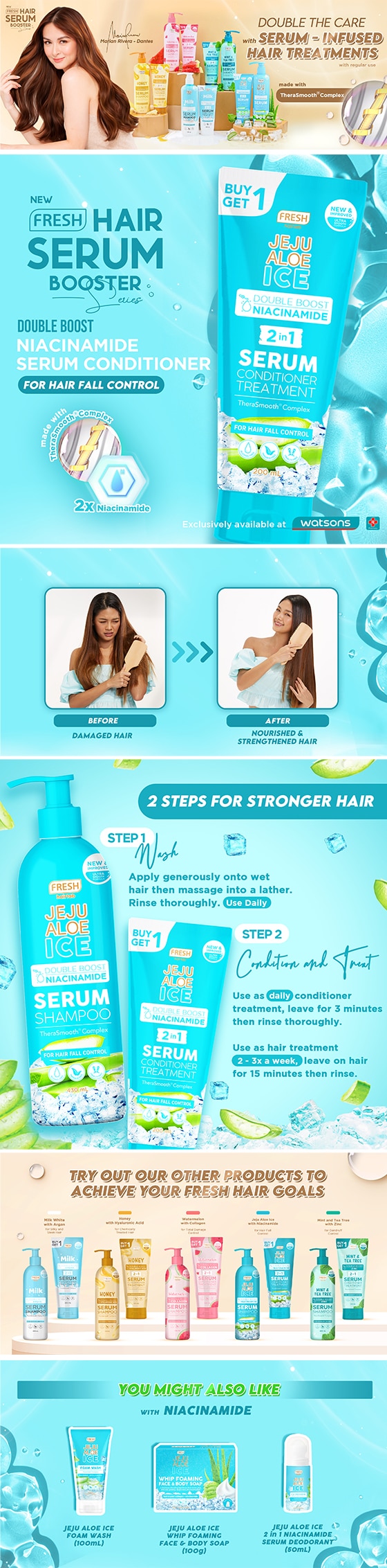 This Jeju Aloe Ice Double Boost Serum Conditioner Treatment is specially formulated with TheraSmooth Complex, a specialized hair smoothing technology that detangles minus the stickiness. Enriched with a double boost of Niacinamide, this deeply nourishes and strengthens hair fibers for total hair fall control.
