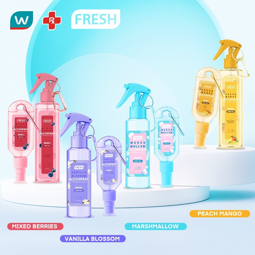 Fresh Marshmallow Alcospray 100 mL Indulge in this aloe vera infused Alcospray, formulated with the playful mix of crisp apples and pears, laced with enchanting aquatic scent of lilies in full bloom. This leaves your skin smelling delicately sweet and 99.99 percent protected from germs and bacteria