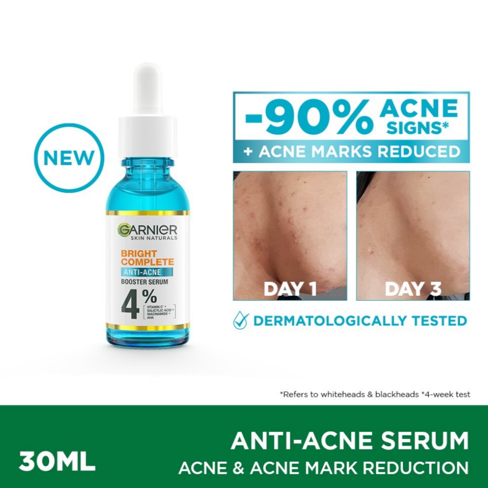 Discover the new Garnier Bright Complete Anti-Acne Booster Serum, with 4% Vitamin C^ + Salicylic Acid + Niacinamide + AHA helps fight acne and fade acne spots in 3 days. Skin is soothed, visibly brighter and clearer.