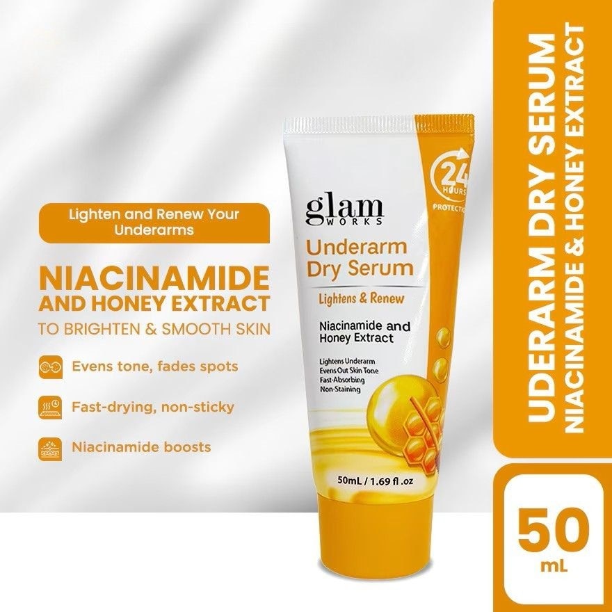 Elevate your skincare routine with Glamworks Underarm Dry Serum. This lightweight serum is designed to nourish and brighten your underarms. Infused with Niacinamide and Honey Extract, it helps lighten and even out skin tone while providing deep moisturization. Enhanced with Sodium Hyaluronate, it delivers intense hydration and strengthens the skin's natural moisture barrier, leaving your underarms renewed, smooth, and glowing.