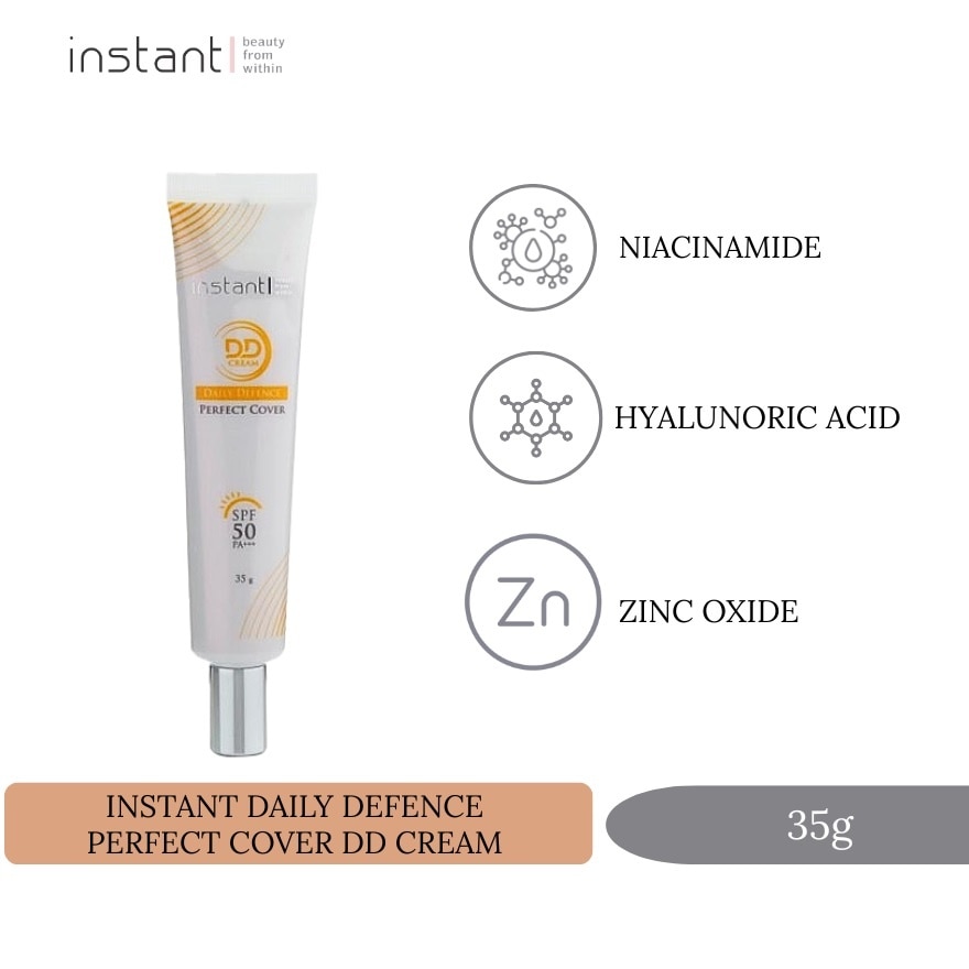 INSTANT Daily Defence Perfect Cover DD Cream combines the benefits of skincare, makeup, and sunscreen in one product. This beige-colored cream provides a naturally luminous finish while softening and smoothing the skin. It locks in moisture and helps improve skin tone and texture, leaving you with healthier, younger-looking skin. The formula is suitable for all skin types and blends seamlessly with various skin tones.