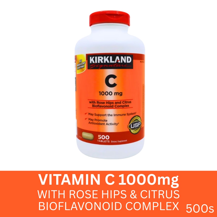 KIRKLAND SIGNATURE VITAMIN C WITH ROSE HIPS PROVIDES ANTIOXIDANT SUPPORT AND PROMOTES IMMUNE HEALTH EACH BOTTLE CONTAINS 500 TABLETS WITH A RECOMMENDED DOSAGE OF ONE TO TWO TABLETS DAILY