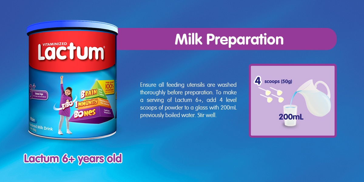 BONES. Lactum 6+ is a high source of Calcium which is necessary for bone health and Vitamin D to support bone development.