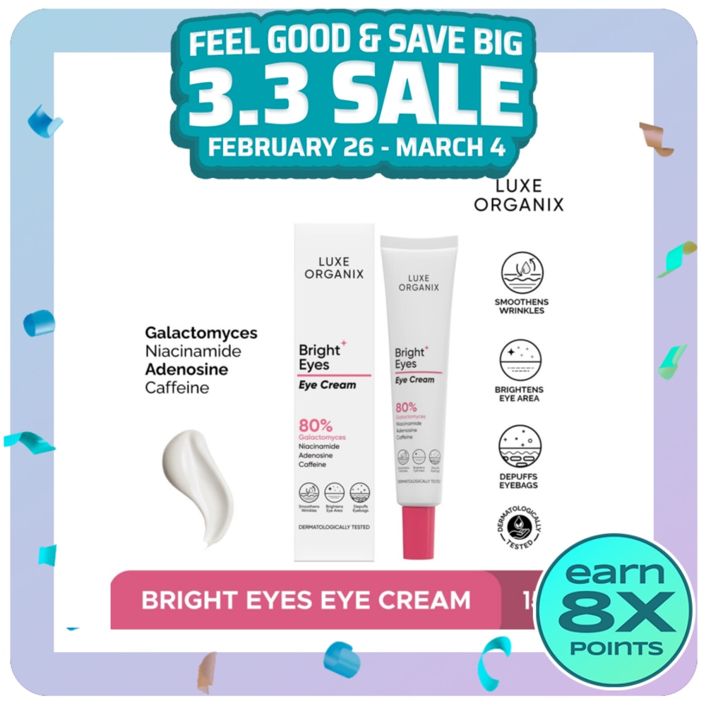 Luxe Organix Bright Eyes Eye Cream is packed with 80% Galactomyces Ferment Filtrate that helps reduces dark circles and puffines while providing intense moisture to fight off wrinkles. It also helps in absorption into the skin maximizing other ingredients like Niacinamide and Adenosine. Say goodbye to tired, dark looking bags with Luxe Organix Bright Eyes!