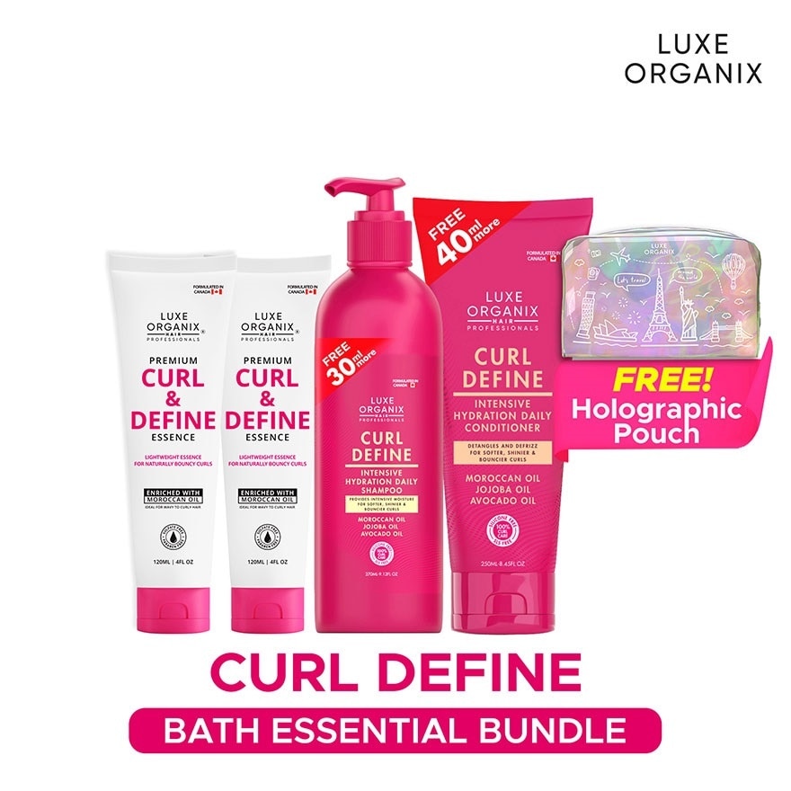 The Luxe Organix Premium Curl and Define Shampoo gently cleanses the hair while effective locking in moisture to prevent dryness. It is formulated with a blend of Jojoba, Avocado, and Moroccan Oil to keep curls strong, healthy, and bouncy embrace and revive your natural curls with this CGM approved shampoo that is perfect for everyday use. The Luxe Organix Premium Curl and Define Conditioner penetrates deeply into the hair follicles to seal in moisture and reduce frizziness. It is formulated with a blend of Jojoba, Avocado, and Moroccan Oil that leaves hair soft, silky, and shiny! embrace and revive your natural curls with this CGM approved conditioner that is perfect for everyday use. Luxe Organix Premium Keratin Curl & Define Essence is paraben free and sulfate free that is formulated in Canada. With high content of antioxidants. Benefits of Luxe Organix Curling Essence: - Easy to use for your favorite bouncy curly hairstyles - Enriched with Moroccan Oil to hydrate and repair your damaged hair - Lightweight"", non-sticky
