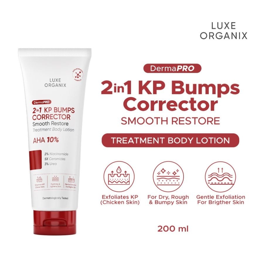 Luxe Organix DermaPRO 2in1 KP Bumps Corrector Smooth Restore Treatment Lotion is a dermatologist-tested daily treatment designed to gently exfoliate and smooth rough, bumpy, and dry skin. Formulated with 10% AHA, it effectively targets concerns like Keratosis Pilaris (chicken skin), strawberry legs, ingrown hairs, and razor bumps, helping to visibly refine skin texture and reveal clearer, healthier-looking skin. Infused with 2% Niacinamide, 5X Ceramides, and 3% Urea, it deeply hydrates, strengthens the skin barrier, and soothes irritation, leaving your skin feeling soft, smooth, and healthy all day long.