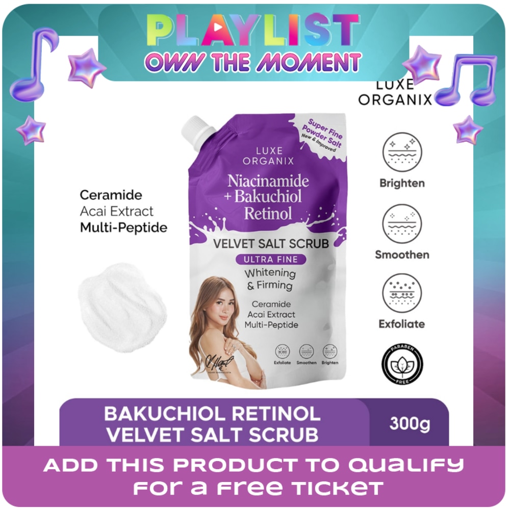 Luxe Organix Niacinamide + Bakuchiol Retinol Velvet Salt Scrub is a nourishing and gentle exfoliator made with premium & super fine powder salt that helps remove dead skin cells on the surface of the skin and promote skin cell renewal to help you achieve brighter and smoother-looking skin. It is infused with Niacinamide, Bakuchiol & Retinol to brighten and firm the skin. With added benefits from Ceramide, Acai Extract, and Multi-peptides to improve skin barrier and texture, while keeping skin moisturized. Achieve a lighter and brighter complexion with consistent use. Ultra Fine Whitening & Firming Ceramide Acai Extract Multi-Peptide