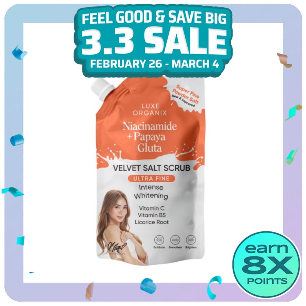 LUXE ORGANIX NIACINAMIDE + PAPAYA GLUTA VELVET SALT SCRUB IS A NOURISHING AND GENTLE EXFOLIATOR MADE WITH NATURAL SALT BEADS THAT CAN REMOVE DEAD SKIN CELLS ON THE SURFACE OF THE SKIN AND PROMOTE SKIN CELL RENEWAL TO HELP YOU ACHIEVE A BRIGHTER AND SMOOTHER LOOKING SKIN. IT IS FORMULATED WITH NIACINAMIDE, PAPAYA EXTRACT, AND GLUTATHIONE WHICH HELPS TO EFFECTIVELY LIGHTEN THE SKIN AND EVEN OUT SKIN TONE. IT HAS ADDED BENEFITS FROM VITAMIN C, LICORICE ROOT, AND VITAMIN B5 TO BRIGHTEN AND BOOST SKIN HYDRATION. ACHIEVE A LIGHTER AND BRIGHTER COMPLEXION WITH CONSISTENT USE.