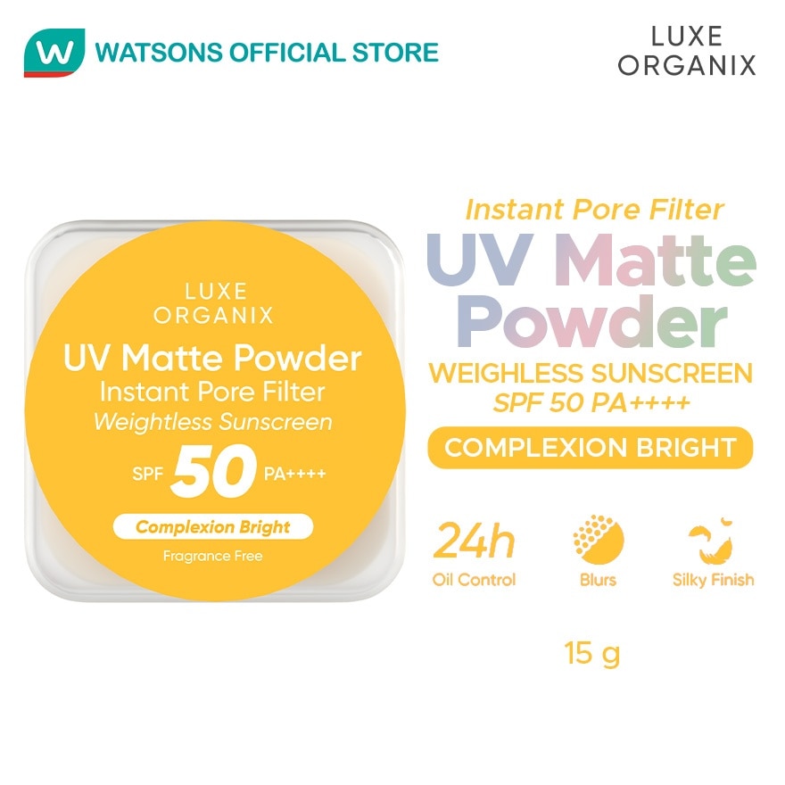 Luxe Organix UV Matte Powder Instant Pore Filter Weightless Sunscreen is a weightless, shine-controlling loose powder designed to effortlessly absorb excess oil for a matte finish that stays put. This powder offers SPF 50 PA++++ UV protection while instantly smoothens the appearance of pores and fine lines, giving your skin a natural, velvety finish. Go for this Complexion Bright shade to set and neutralize red or dark undertones. Step up your beauty game and embrace a flawless, shine-free complexion that lasts all day!