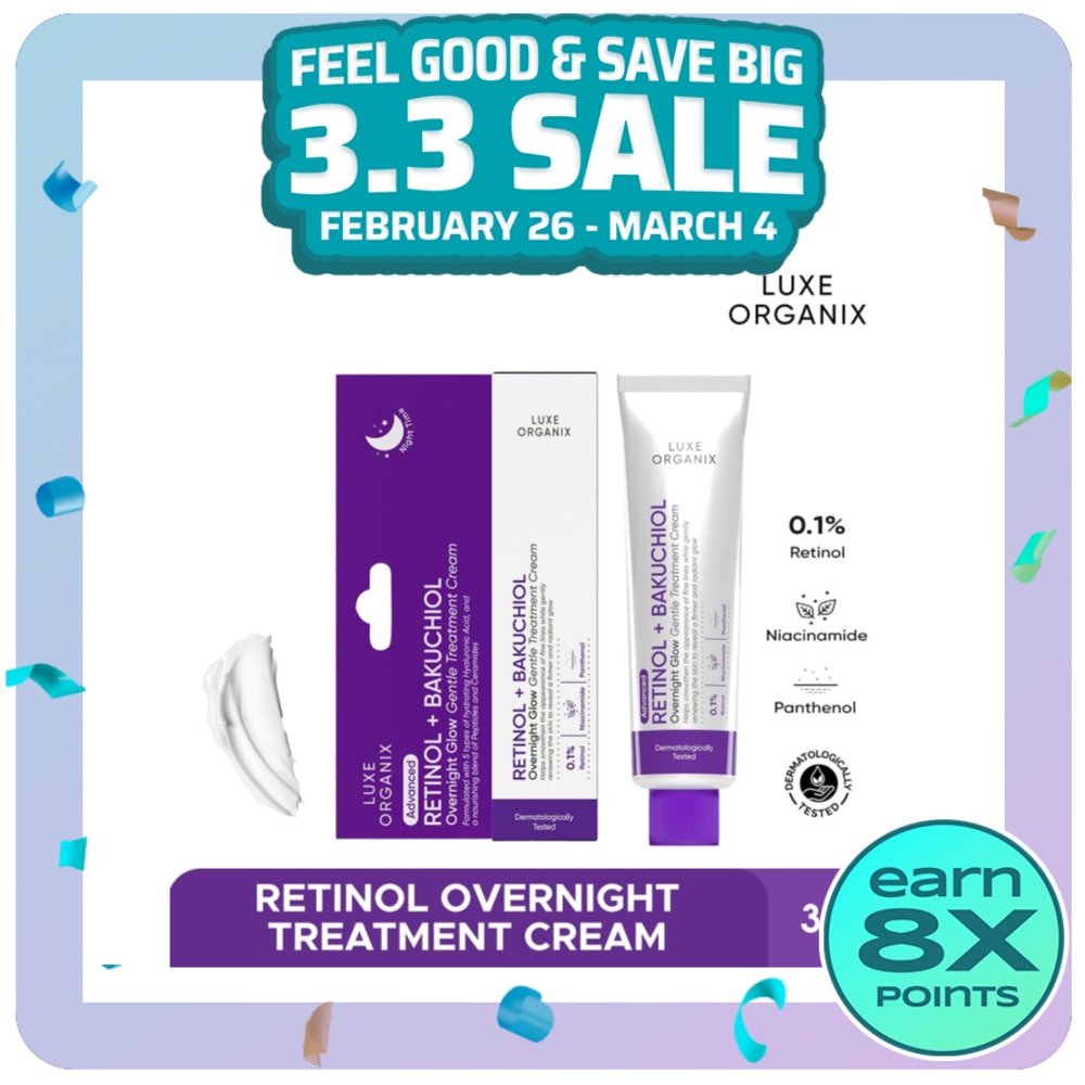 Luxe Organix Retinol + Bakuchiol Overnight Glow Gentle Treatment Cream contains 0.1% pure retinol, the superior anti-aging active that helps wrinkles, fine lines, and loss of skin firmness. It works together with Bakuchiol, a natural extract that helps stimulate collagen production and enhances retinol's effect while still being gentle on the skin. It is also formulated with 5 types of Hyaluronic Acid & a powerful blend of Peptides & Ceramides to smoothen the skin barrier while locking in hydration to alleviate dryness and irritation. With additional benefits from Niacinamide that brighten the skin's complexion to help you maintain a youthful glow. This retinol cream is powerful, yet gentle on the skin and is recommended for those who want to prevent early signs of aging.