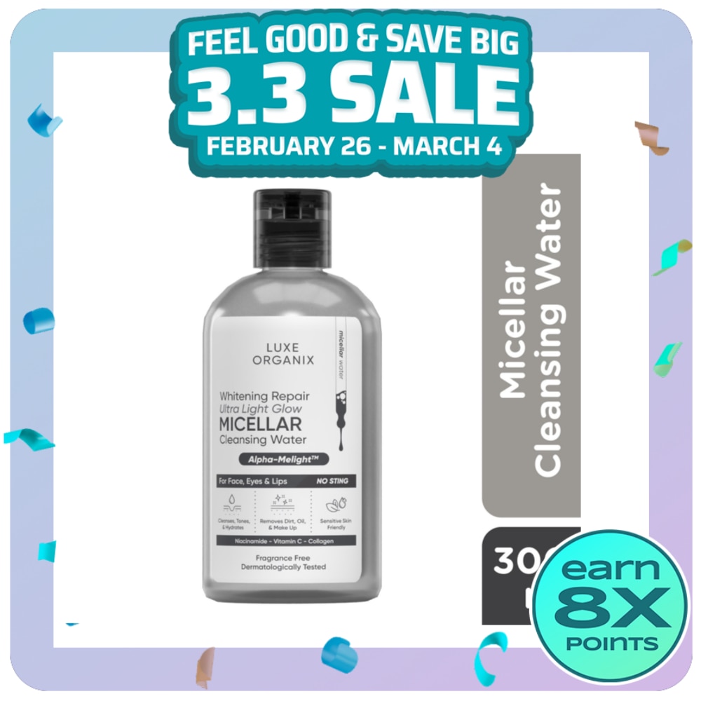 Luxe Organix Whitening Repair Ultra Light Glow Micellar Cleansing Beauty Water cleanses, tones, and removes makeup with just one swipe! This multi purpose micellar water gently removes makeup, excess oil, and dirt residues on the skin without the need to rinse with water. It contains Alpha Melight , an all-natural and powerful complex that is proven to reduce dark spots and hyperpigmentation. With additional benefits from Niacinamide, Vitamin C, and Collagen for that triple boost of brightening and glow!
