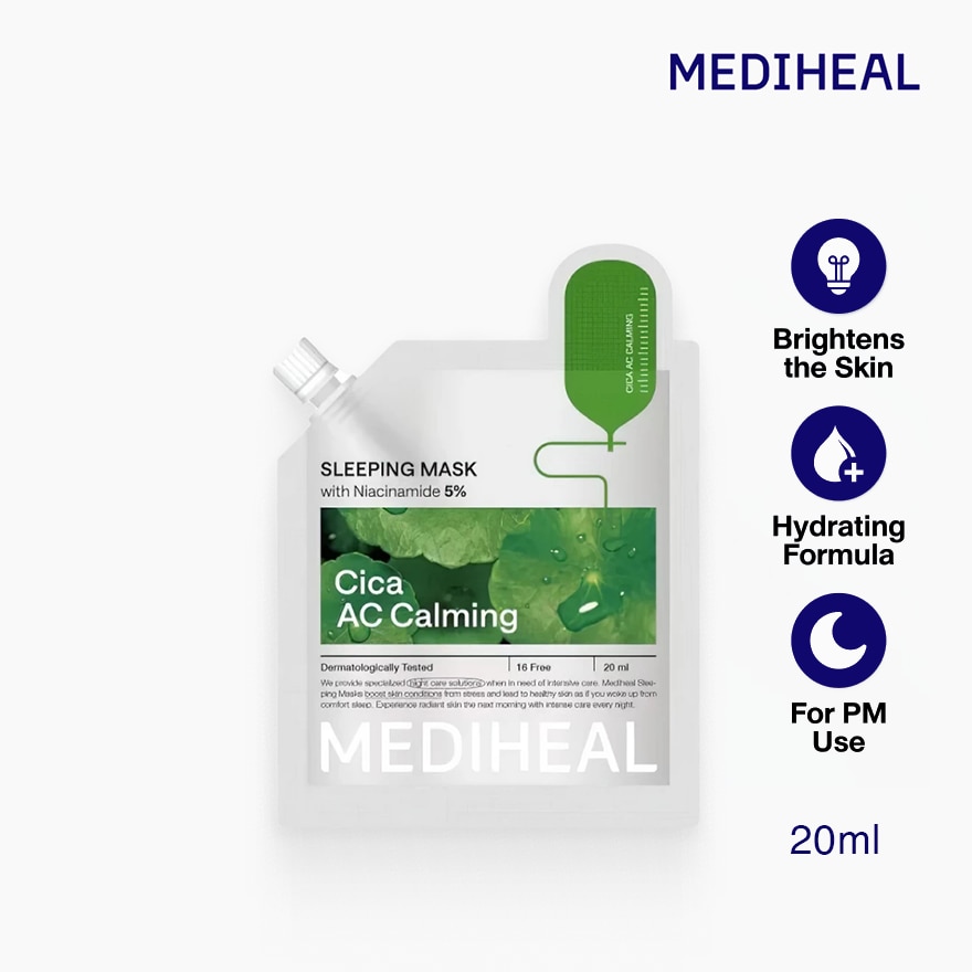 Mediheal Cica AC Calming Sleeping Mask with transparent gel texture,is used to treat acne, glow and moisturize. It is suitable for tired and dull skin due to skin problems. It contains extract. Niacinamide 5%, panthenolic activity 3X, tea tree extract, and zinc PCA provide a fresh, cool, and moisturizing sensation to the skin.Adopting unique Calmingbox technology, Mild to sensitive skin, as it has undergone stimulation testing by dermatologists and does not contain 16 harmful substances, as well as parabens and preservatives. Alcohol, etc. After moisturizer, apply evenly to face as the last step in your nighttime skincare routine. Leave on overnight and rinse off in the morning. Can be used daily.