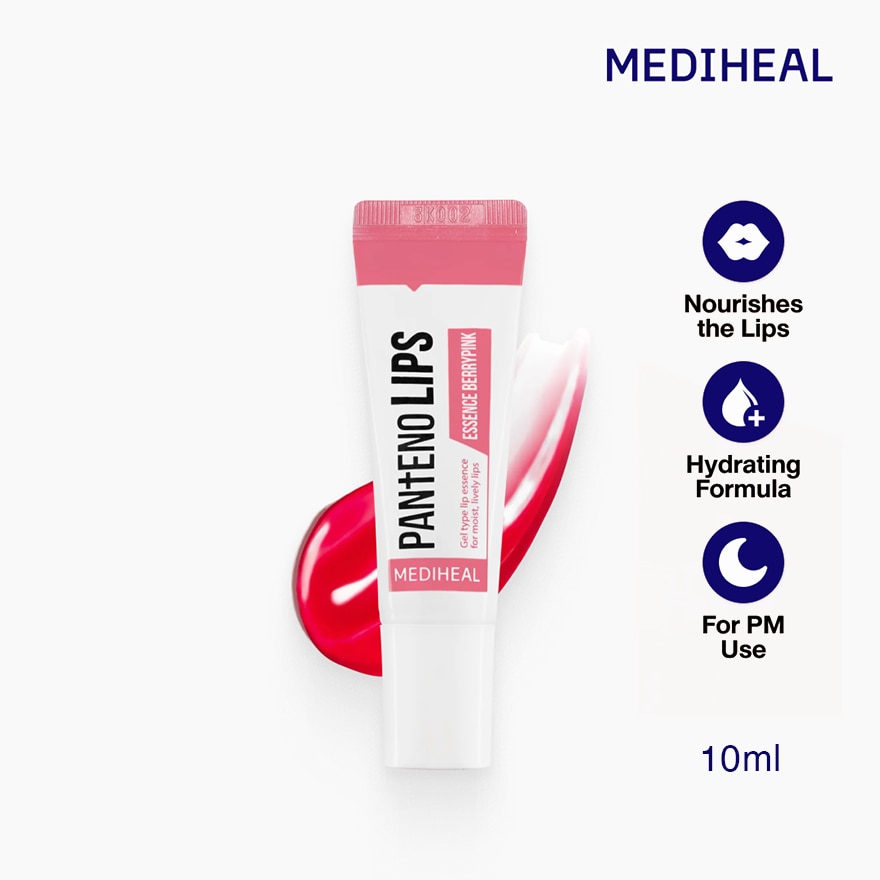 Mediheal Pantenolips Essence Berrypink Red and pink lip essence that fills dry and dull lips with natural vitality leading to smooth and glossy lip. Rich in anti-oxidants and helps reduce melanin pigment. With extracts from various berries, wild cherries, raspberries, and strawberries, as well as vitamin E. Helps adjust the color of dark lips. Return to pink natural look. Complete with deep nourishment Add moisture to your lips, making them smooth, soft and shiny. From panthenol and 5 types of natural oil extracts. Can be used on sensitive skin as it is dermatologically tested. No parabens, no preservatives. and no alcohol 1.Open the cap 2.squeeze a suitable amount on lips 3.then use fingers to apply evenly.