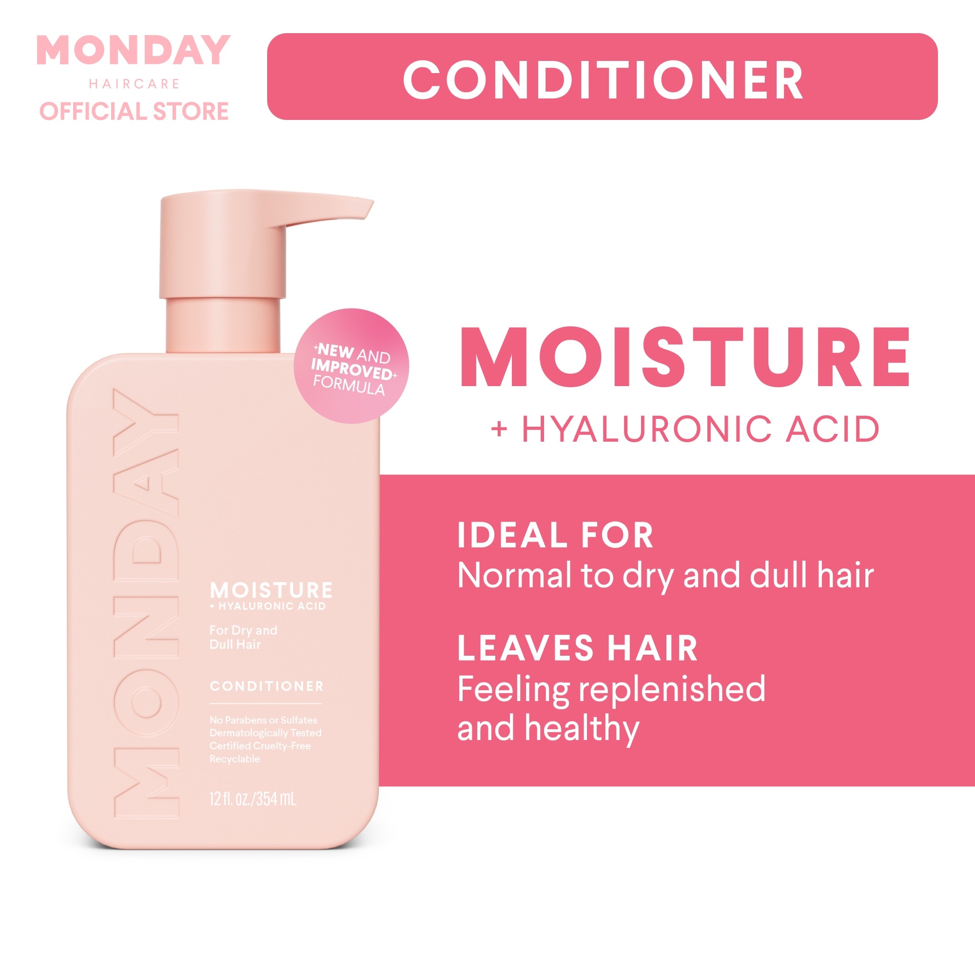 MONDAY HAIRCARE MOISTURE CONDITIONER FOR WOMEN IS GOOD FOR DRY, DAMAGED AND STRESSED HAIR AND COILY AND CURLY HAIR TYPES. IT’S ALSO SAFE FOR COLOR-TREATED HAIR. THIS MOISTURIZING CONDITIONER HELPS TO HYDRATE AND NOURISH HAIR WITH COCONUT OIL, RICE PROTEIN, SHEA BUTTER AND PROVITAMIN B5—INGREDIENTS THAT HELP SUPPORT HAIR HEALTH AND MAINTAIN NORMAL HAIR GROWTH AND THICKNESS. FOR BEST RESULTS, USE WITH MONDAY HAIRCARE MOISTURE SHAMPOO./N /NMONDAY HAIRCARE’S SALON-QUALITY SHAMPOO AND CONDITIONER FORMULAS ARE DERMATOLOGICALLY TESTED, PH-BALANCED, AND FREE FROM SLS, PARABENS AND PHTHALATES. THEY INSTEAD CONTAIN PREMIUM NATURAL INGREDIENTS SUCH AS SHEA BUTTER, COCONUT OIL, RICE PROTEIN, VITAMIN E AND PROVITAMIN B5 TO NOURISH AND RESTORE. /N /NOUR RANGE OF SHAMPOO AND CONDITIONER HAS CLOSE TO A DOZEN MAJOR BEAUTY AWARDS, INCLUDING A COSMOPOLITAN 2021 HOLY GRAIL BEAUTY AWARD, GLAMOUR 2021 BEAUTY AWARD, COSMOPOLITAN 2021 BEAUTY AWARD, AND AN INSTYLE 2022 BEST BEAUTY BUY AWARD. MONDAY HAS ALSO BEEN FEATURED BY VOGUE, ELLE, HARPER’S BAZAAR, ALLURE, REFINERY29 AND BYRDIE./N /NALL OF MONDAY’S PRODUCTS ARE APPROVED AS CRUELTY-FREE UNDER THE LEAPING BUNNY PROGRAMME. WE’RE ALSO PROUD TO BE RECOGNISED BY PETA AS A BRAND THAT DOES NOT TEST ON ANIMALS. OUR PINK BOTTLES ARE ALSO MADE FROM 100% RECYCLABLE PLASTIC TO HELP MINIMISE CARBON FOOTPRINT AND REDUCE LANDFILL.