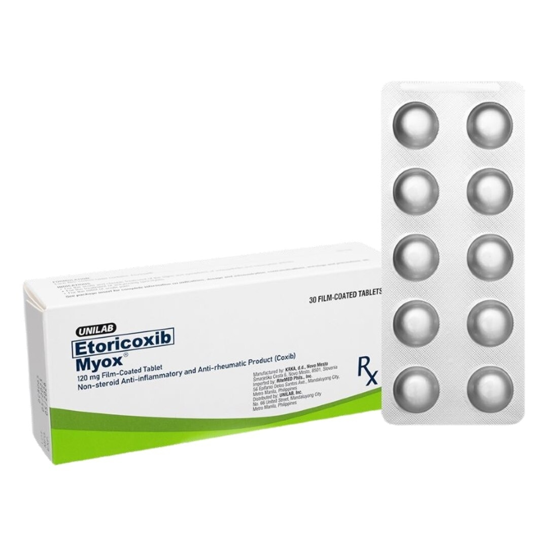Etoricoxib (Myox5) 90 mg Film-coated Tablet: Brownish red, round, slightly biconvex, film-coated tablets with beveled edges, scored on one side of the tablet.