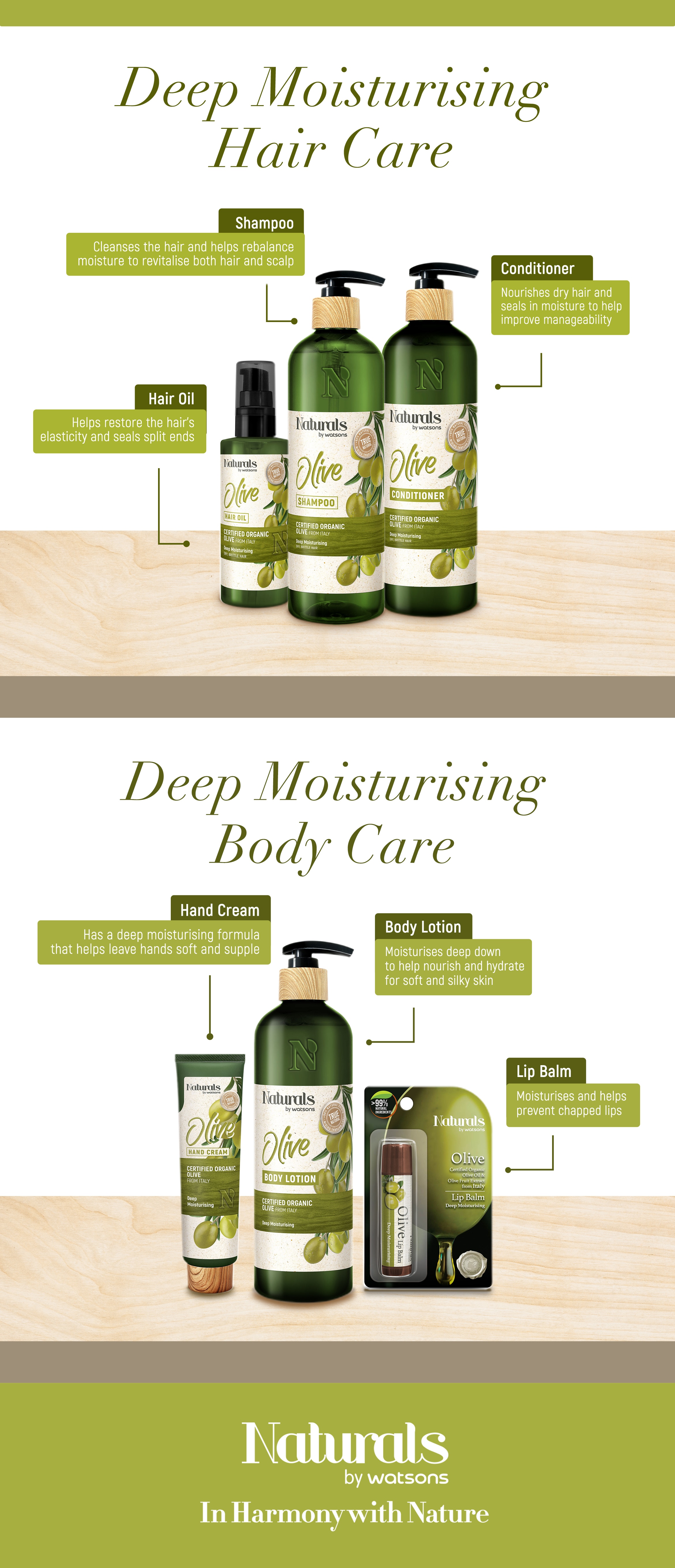 Natural by Watsons Olive Hair Oil can be used in 2 ways: 1) After shampooing gently pat hair dry with towel. Apply 1-2 pumps of hair oil evenly onto your hair. No need to rinse. 2) Use on dry hair for smoothing and boosting hair shine. No need to rinse. It is recommended for daily use together with Naturals by Watsons Olive Shampoo & Conditioner.