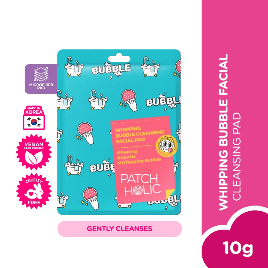 Whipping Bubbles Cleansing Facial Pad smoothens and moistens skin by removing dead skin cells to improve skin texture. Forms a protective barrier filled with AHA, BHA, PHA. Gently exfoliate mild peeling, excess sebum, and impurities with its silk stretch microfiber pocket pad that provides a dual texture layer. Whip your skin into shape!