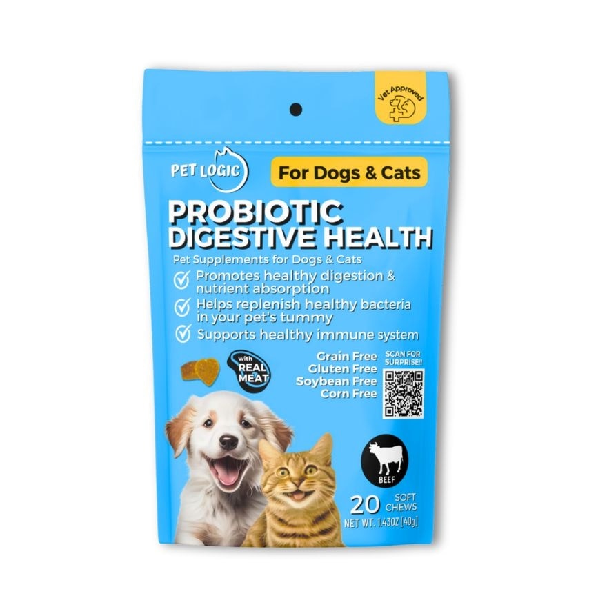 Pet Logic Probiotic Digestive Health 2g x 20 Dog & Cat Chews Pet SupplementGood digestion starts with a healthy gut. Treat your fur babies to something special with Pet Logic’s Probiotic Digestive Health. These Tummy Treats are expertly crafted by veterinarians to protect and strengthen your pet’s tummy. This is specially made for both dogs and cats! These soft functional chews aren’t just tasty, they can be a great source of nutrition as well.Pet Logic chews are protein-rich blends made with top-quality meat. It is enriched with lots of essential nutrients that your fur babies need to enjoy a long and healthy life. Each chew is enriched with prebiotics and probiotics that promote the growth of beneficial gut bacteria that aid in digestion and overall health.Key BenefitsImproves Digestions- This enables your pet to absorb the nutrients better from the food that they eat. It regulates the digestion of your pet which can help ensure a healthy bowel movement. Daily intake can reduce bloating, less tummy troubles, better digestion, and a better immune system.Regulates Intestines- Supports digestive health. These chews are made with prebiotics and probiotics that produce good gut bacteria to protect the tummy from bad bacteria. Reduces tummy troubles and promotes gut health.Better Nutrient Absorption- Good gut bacteria create an optimal environment for nutrient absorption. This ensures that your fur babies not only enjoy the delicious treat but also get the maximum nutritional benefits from each bite.Better Immune System- Prebiotics and probiotics in the digestive system can help reduce yeast infection and protect your pet’s overall health. Having a healthy gut results in a better immune system that can help them enjoy a healthy and happy life.