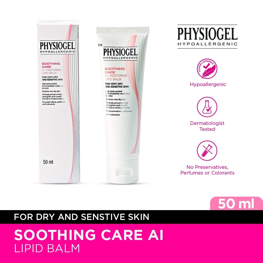 ">High lipid content to immediately moisturize and soothe very dry and rough skin Physiogel Soothing Care A.I. Restoring Lipid Balm works naturally and gently with the skin to help strengthen skin moisture barrier leaving it softer, smoother and visibly healthier. >The innovative formula contains high lipid content with advanced BioMimicTechnology and Palmitamide MEA (PEA) to help resolve skin dryness and sensitivities. It protects against irritants that can aggravate dry and sensitive skin. >No preservatives, perfumes and colourants >Clinically tested. Hypoallergenic. Non-comedogenic."