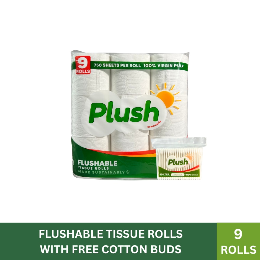 PLUSH ULTRA SOFT FLUSHABLE BATHROOM TISSUE (3-Ply, 9 Rolls)Plush Ultra Soft Flushable Bathroom Tissue is designed to dissolve easily in water, preventing blockages and reducing maintenance. It’s clog-safe and septic-safe, making it perfect for any household.This unscented and hypoallergenic tissue provides a smooth, gentle clean with every use, crafted with 3-ply premium paper for superior comfort and strength.Bonus: Each pack comes with FREE Plush Cotton Buds (400 tips) — made from eco-friendly materials for a soft, hygienic clean anytime.