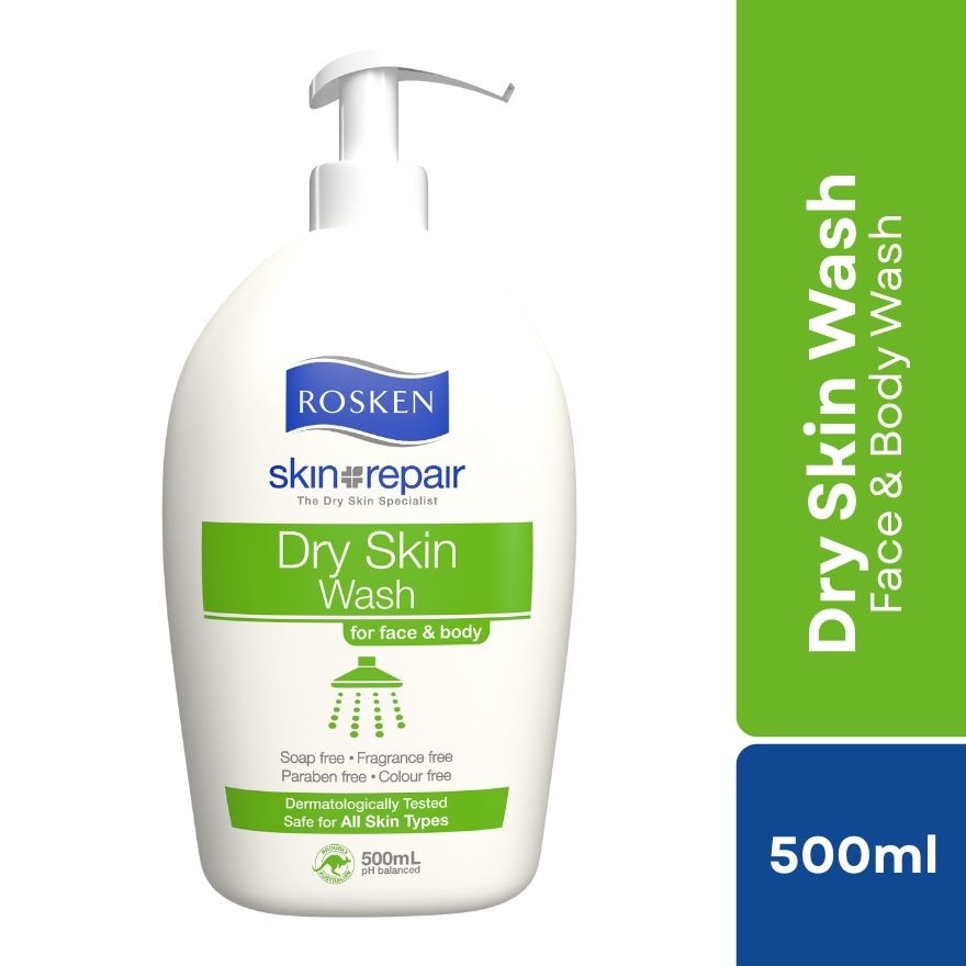 Rosken Dry Skin Wash for face body is nourishing with Vitamin E and safe for all skin types. Soap free fragrance free paraben free and colour free.