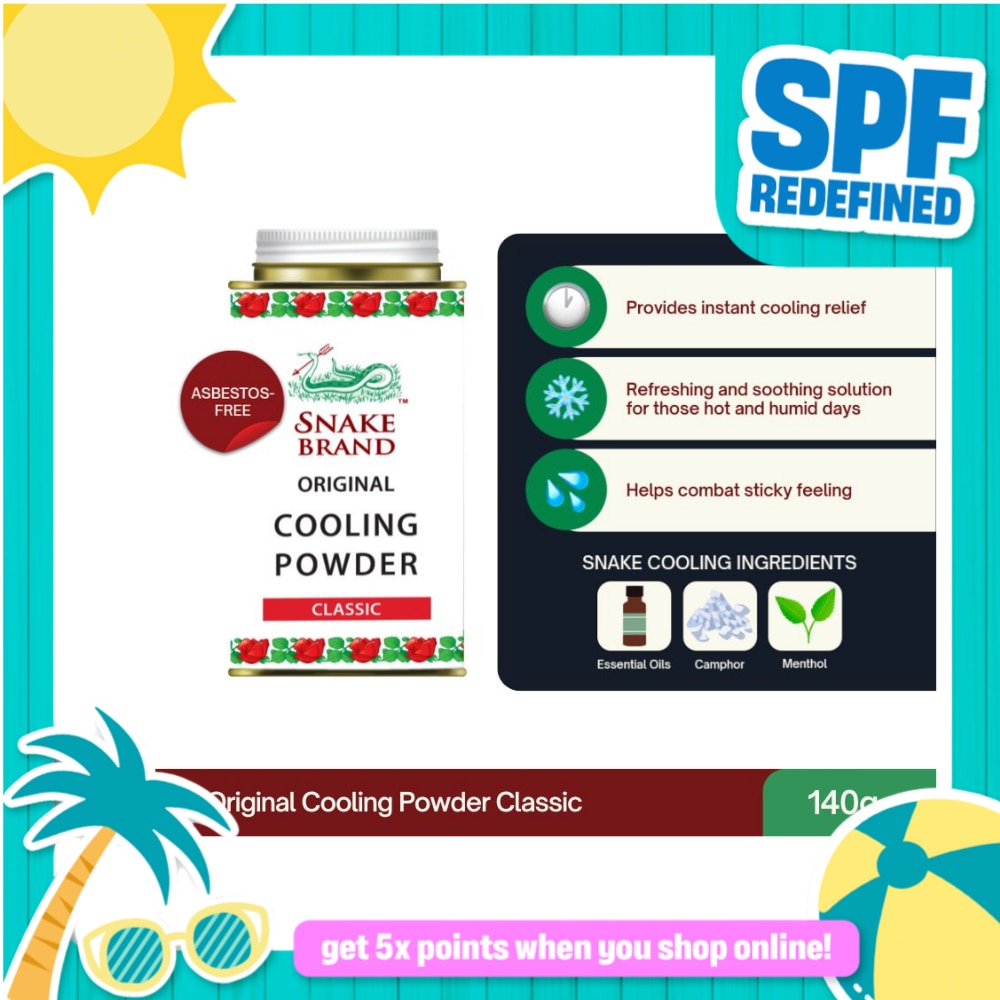 Snake Brand Prickly Heat Cooling Powder Classic is the original cooling and soothing powder. It contains a signature blend of natural herbs and essential oils to help refresh skin. It is suitable for daily use and is recommended to be used after bath as absorbent dusting powder.