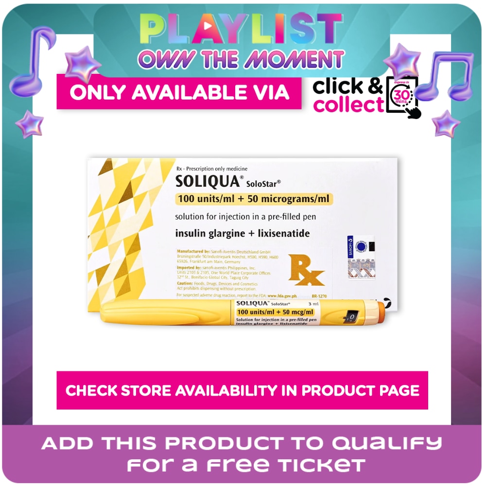 ![Insulin Glargine 100 Units/mL + Lixisenatide 50 mcg/mL [PRESCRIPTION REQUIRED] Available In Click & Collect Express Only](https://medias.watsons.com.ph/publishing/SOLIQUA%20YELLOW%20-%2050027209-BwcKgRMr-eLYLQIwE-zoom.png?version=1776939595)