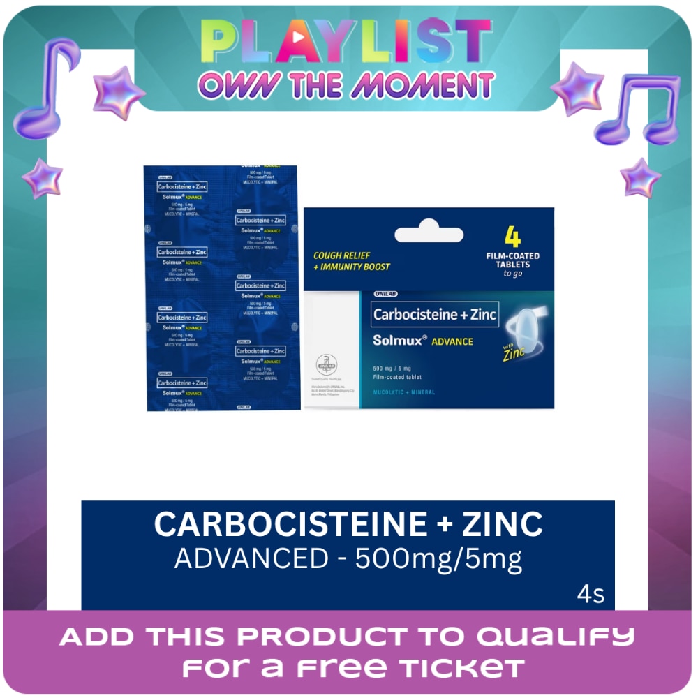 Solmux Advance fights cough due to viruses because of its combination of Carbocisteine which causes phlegm to melt, making it easier to cough up and expel. Reduces and removes bacteria in phlegm. Zinc helps boost immunity. Functions as an antioxidant