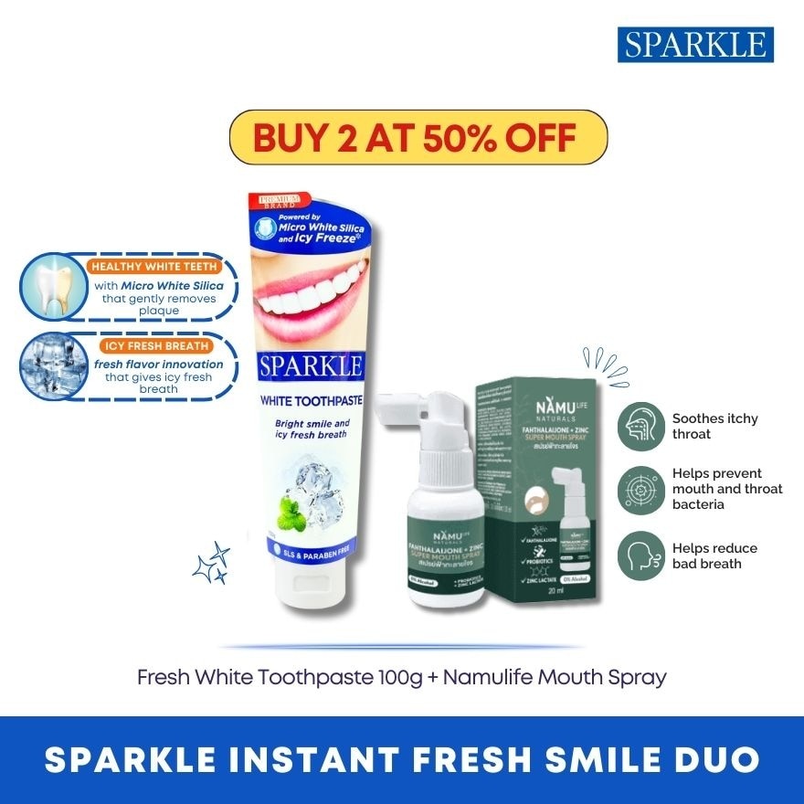 "Get all-day fresh breath and healthy, white teeth with the Instant Fresh Smile Duo. The NAMULIFE Naturals Super Mouth Spray, crafted from the powerful Andrographis Paniculata (Fahthalaijone) herb, provides a freshness while effectively decreasing bacteria. Infused with the goodness of Probiotics, Hyaluronic acid, and Zinc, this innovative formulation ensures enhanced protection for your oral health. Experience the fullness and freshness of life with our scientifically blended mouth spray, designed to prevent bacterial proliferation and reduce bad breath.