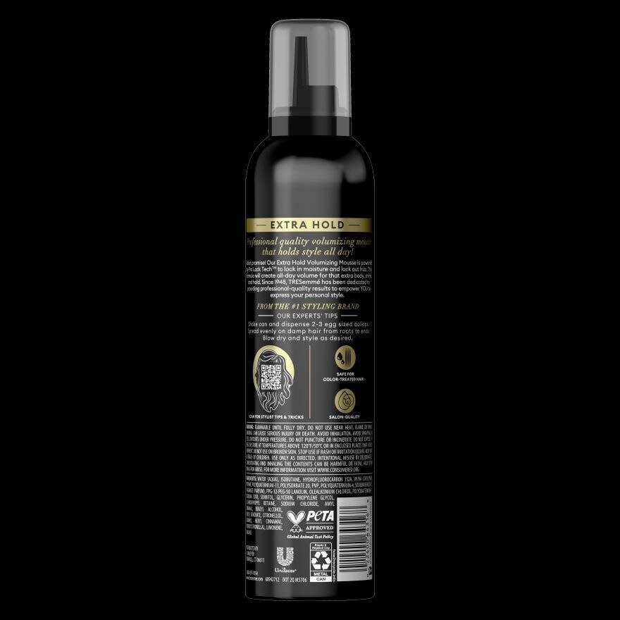 For 70 years, Tresemme has helped women express themselves confidently as they make their mark on the world. Driven by a simple truth: every woman deserves to look and feel fabulous, like they've just stepped out of the salon. EXTRA HOLD Professional quality volumizing mousse that holds style all day! Salon promise! Our Extra Hold Volumizing Mousse is powered by Pro Lock TechTM to lock in moisture and lock out frizz. This formula will create all day volume for that extra body, shine, and hold. Since 1948, Tresemme has been dedicated to providing professional-quality results to empower YOU to express your personal style. FROM THE Number 1 STYLING BRAND OUR EXPERTS TIPS Shake can and dispense 2 to 3 egg sized dollops. Spread evenly on damp hair from roots to ends. Blow dry and style as desired. SAFE FOR COLOR TREATED HAIR SALON QUALITY