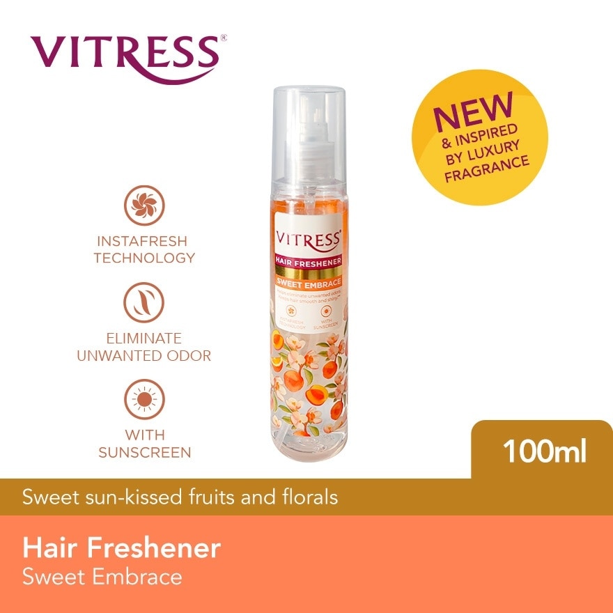 Sweet sun-kissed fruits and floralsThe hair struggle is real! Pollution, smoke, and sweat are just some of the odors that cling to our hair everyday.But with VITRESS HAIR FRESHENER, you’ll never have to worry about that again. It’s InstaFresh Technology instantly eliminates unwanted odor, while Anti-Bacterial Actives offer added protection from odor-causing bacteria leaving your hair with a refreshing, long-lasting fragrance and shine.