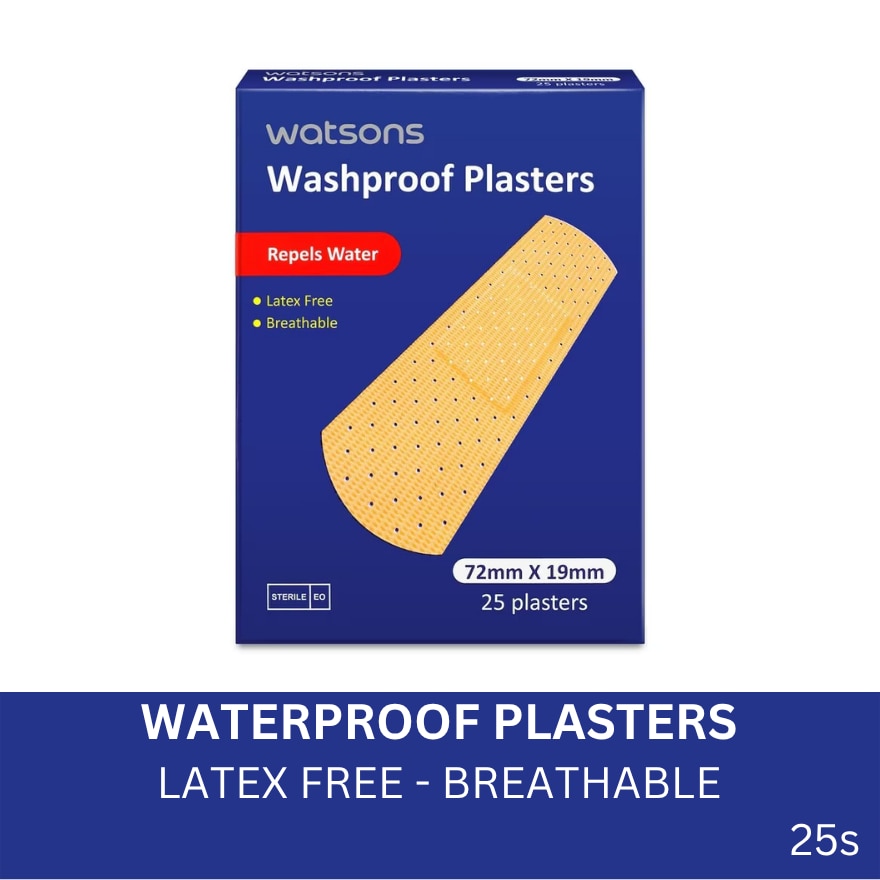 Watsons Washproof Plasters are sterilized ventilated and water resistant to allow the wound to breath and help the natural healing process. They are latex free and suitable for sensitive skin.