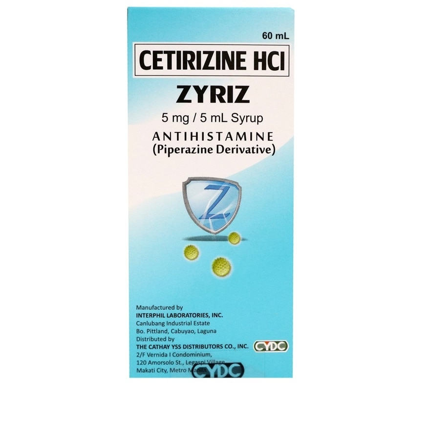 Each 5mL (1 teaspoonful) of Zyriz Syrup contains 5mg of Cetirizine HCL in Grapes Flavor
